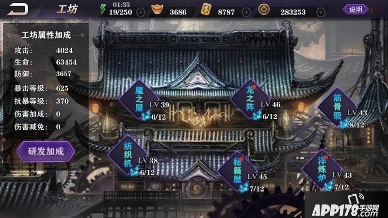 5、工坊建设:6个项目可以建设研发,随等级提高逐步开放,铜币的主要消耗就在这里了,到后期研发升一级动辄数十万的铜币,少年还不赶快去换银子?突破所需的铃铛和书主要通过刷图获得,产量略低,想快速提升的话可以到商店去买,20元宝或者200竞技币。