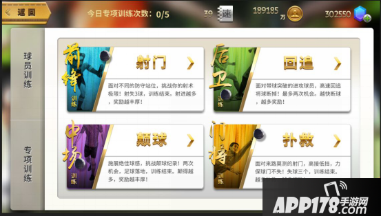 在训练基地中,提供了四种专项训练小游戏分别用来训练不同位置的球员。