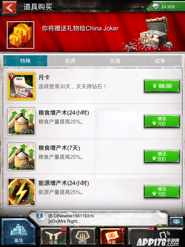 在联盟中还可以相互赠送礼物,可以赠送月卡等游戏商城中的物品,以此来加强相互之间的关系,也可以利用来管理联盟,比如盟主发放奖励等来加强联盟的凝聚力和活跃度。
