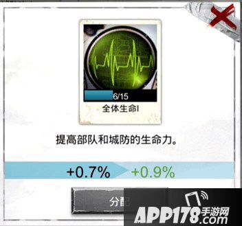 效果是提升部队和城防生命力,任何游戏加血都是很实在的技能,所以疯狂的加了起来,点到6级,生命力提升0.7%。推测满级也不会太高,同上,还是多生产部队吧。