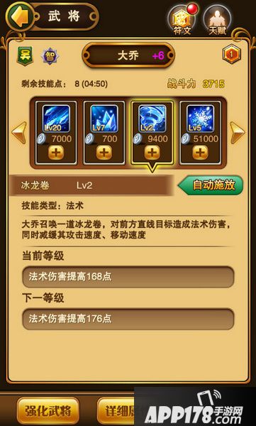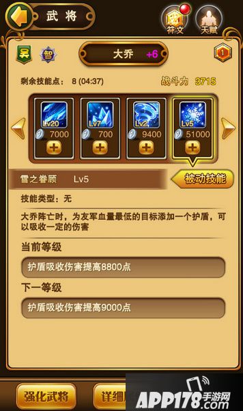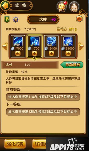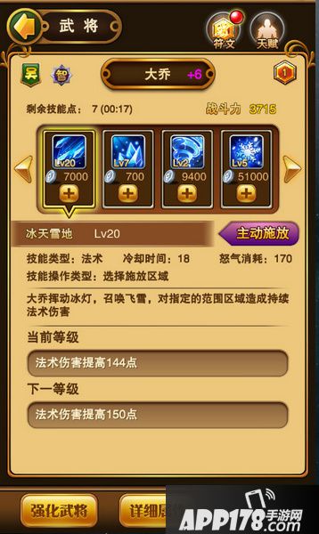 冰天雪地:大乔的主动技,法术攻击,18秒冷却时间,怒气消耗170,每次升级增加6点伤害。