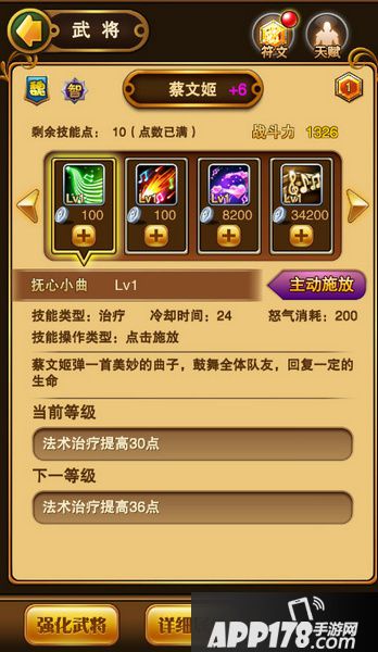 抚心小曲:蔡文姬的主动技,法术治疗,24秒冷却时间,怒气消耗200,每次升级增加6点治疗量。