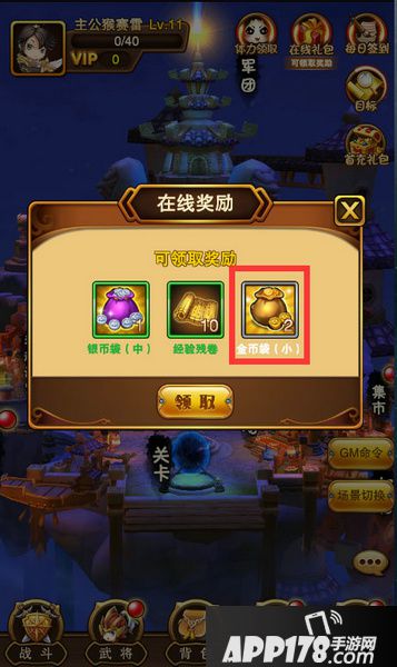 在主界面右上方有在线礼包按钮,玩家在线时,每隔一段时间可领取,内有大量银币、金币和道具奖励,千万别忘了哦。
