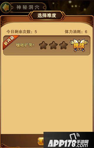 两个玩法都是点击进入矿洞按钮后打开玩法说明及界面,点击战斗则进入难度选择界面,选择好难度就可以进入战斗了,每次挑战消耗6点体力,每天可挑战5次。两种玩法随着等级的提升,可以体验更高难度的关卡,但必须通关前面的关卡
