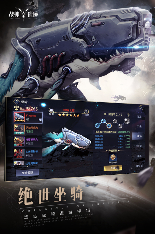 《战神遗迹》坐骑大版本来袭!全新科幻坐骑机械天鲸,炽翼魔羽,夜翼龙鹫登场,不同属性满足誓约者多种策略搭配,陈赫反派代言宣战全网,化身大魔神降临多元宇宙!主机级画面品质打造成神试炼,在酷炫爽感中体验随机副本与竞技团战,感受多文明纷争中的探索冒险。载游戏百万福利等你来拿,拯救十二圣女,来,一战成神!