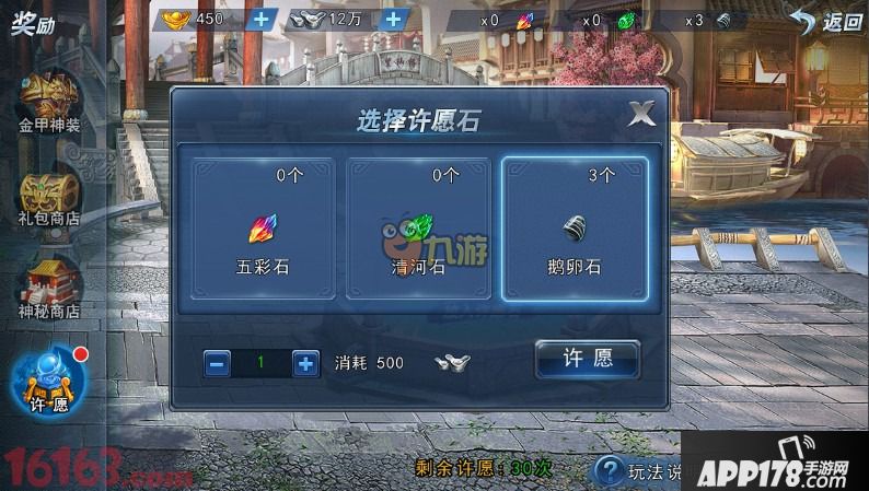 每日有总的许愿次数限制,其中使用五彩石许愿不消耗次数,使用鹅卵石、清河石许愿则消耗次数。