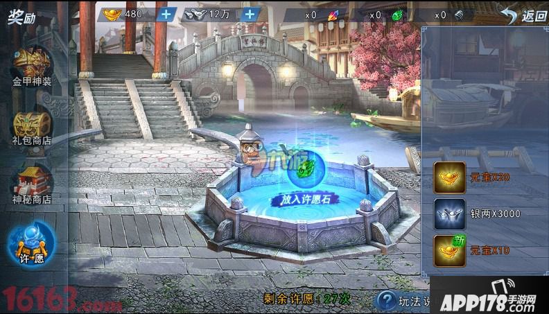 斩魂手游中,可由奖励系统进入许愿界面。把拥有许愿石投入许愿井中进行许愿,获得奖励。