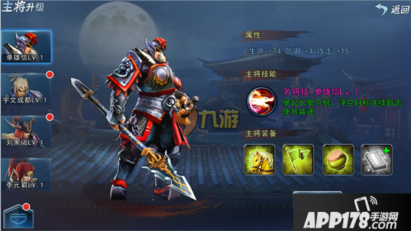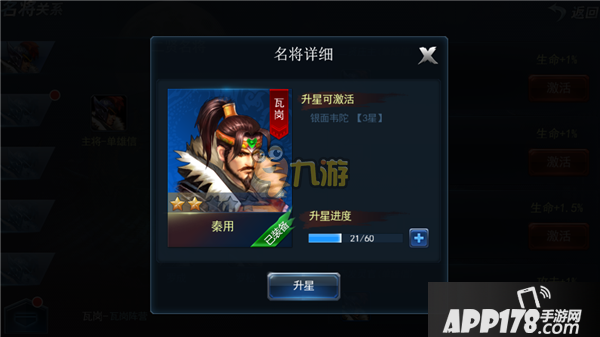 集齐主将每级需要的名将装备,则主将可升级,升级后将增加属性以及名将技能的等级