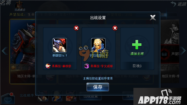 可以选择出战的名将技能,以及他们的顺序,最多可选择3个