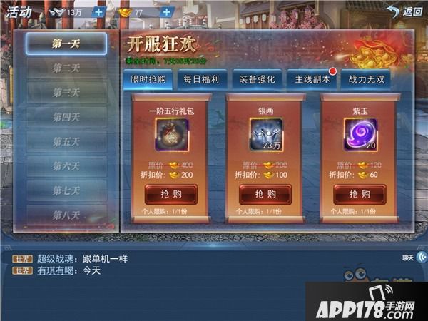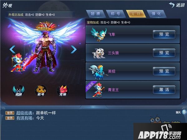 福利、成就、奖励神马的想必玩家都心里有数,愉快玩玩游戏前期还是没有问题的。主界面,占屏1/4的聊天框吓坏了小编,不过这也让世界显的不那么无聊,叽叽喳喳的讨论氛围,吾道不孤啊。时尚的外观,Vip专属的宠物、称号、翅膀,这些自然就是赤裸裸的金元诱惑,玩家自己掂量荷包行动吧。
