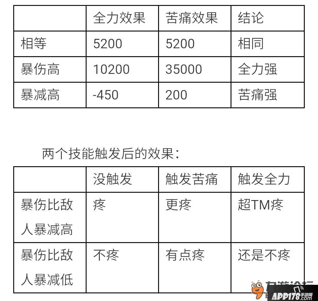 情况二: 自身暴伤加40000比敌人的暴伤减免35000高,全力带来差值收益(45200-35000)=10200,苦痛带来差值收益(40000-30450)=9550,全力的收益要比苦痛高。