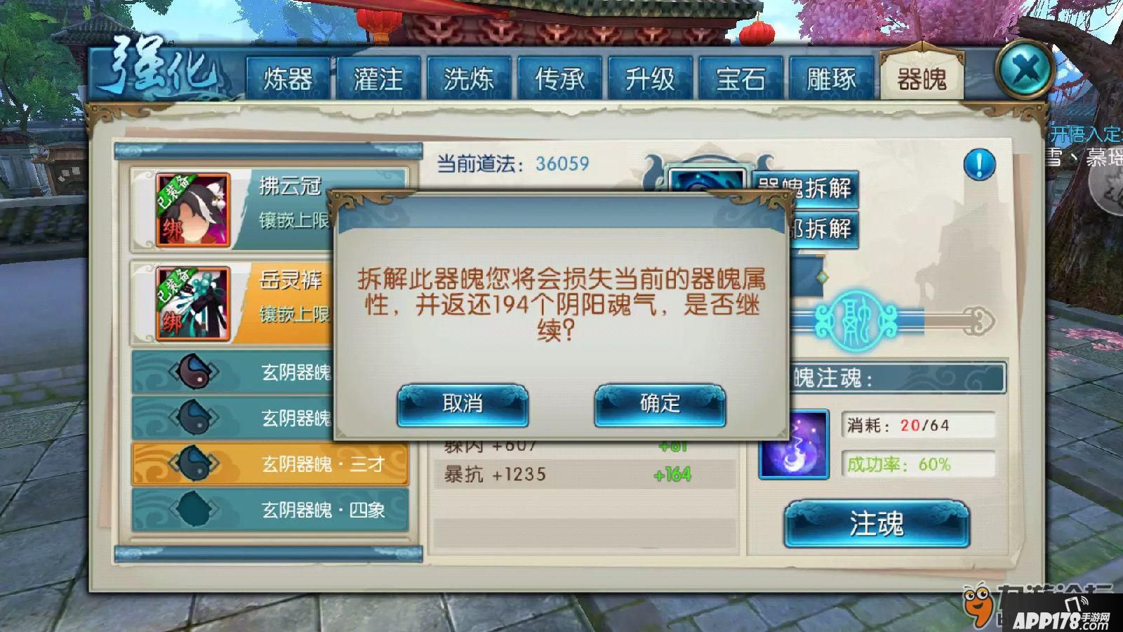 器魄传承一般只是同品质装备向更高级装备传承,否则无法进行,只能通过器魄拆解,再重新进行镶嵌。如图,消耗的器魄会折算成注魂材料阴阳器魄,并返还注魂成功所消耗的材料。