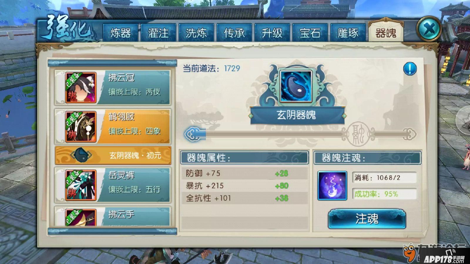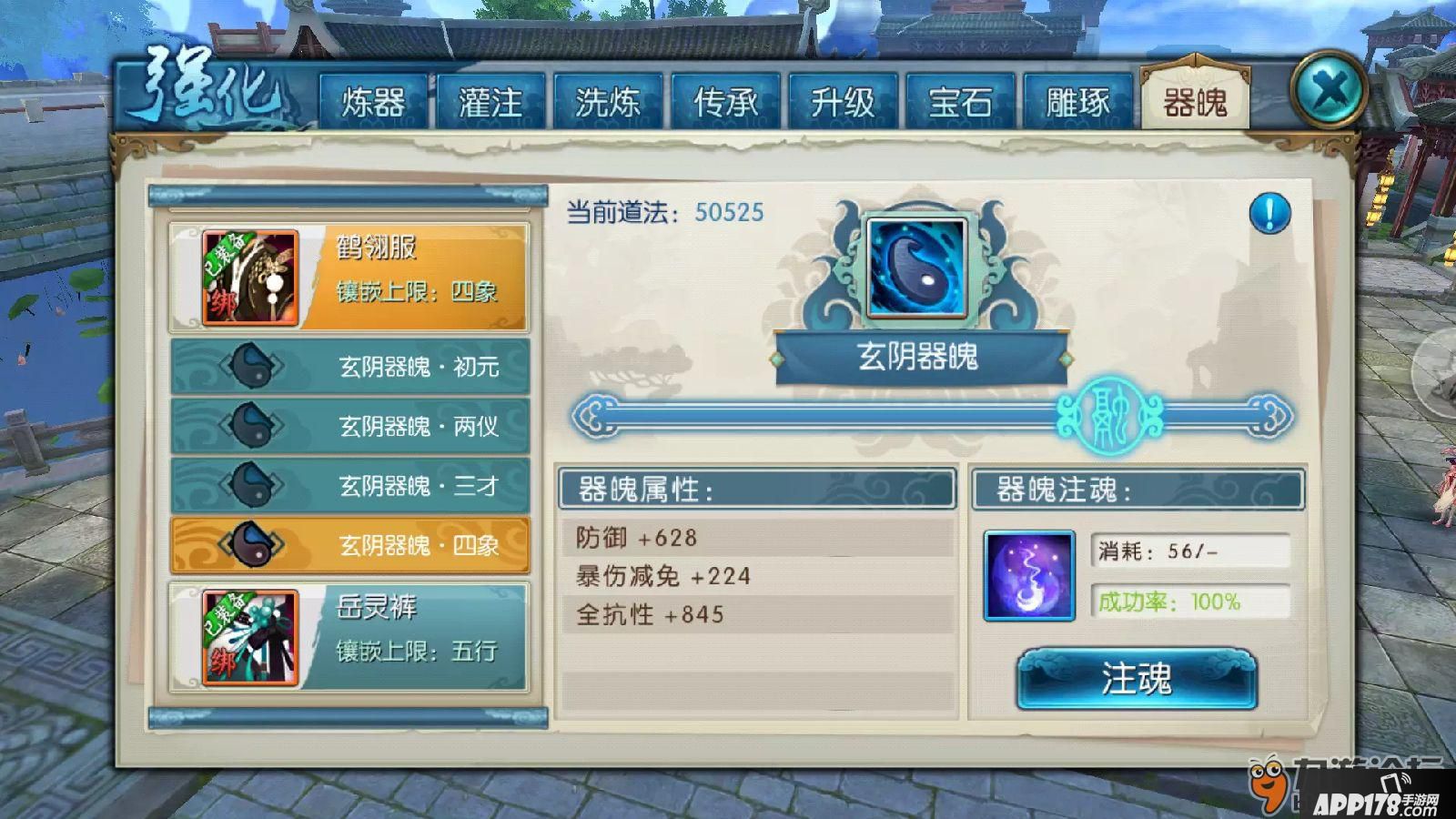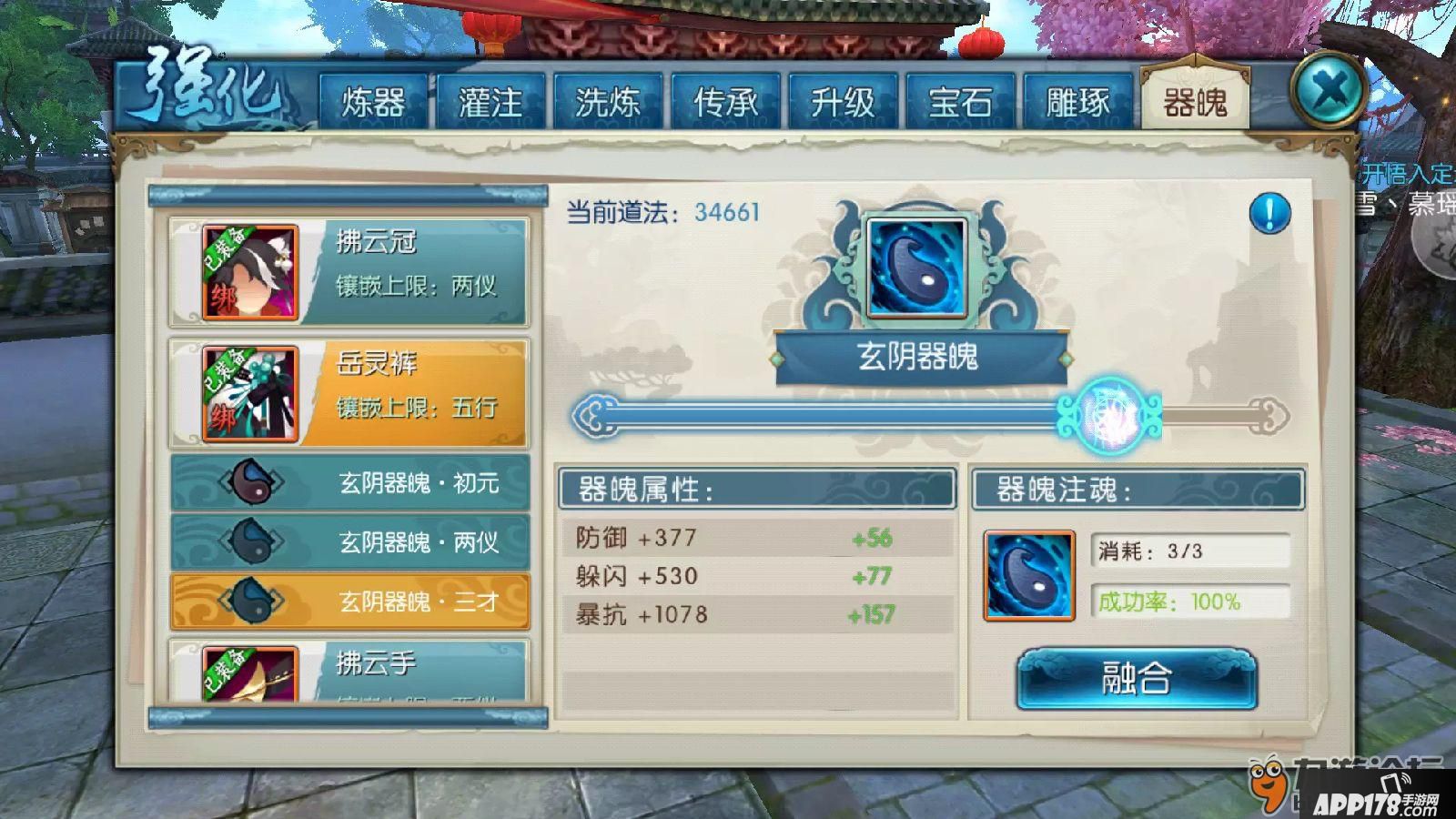 成功7次后就可以进行器魄融合,此时消耗3个器魄,可以开启下一个镶嵌栏(但是不能超过装备等级镶嵌上限),融合后还可以继续注魂直到经验条满,如图: