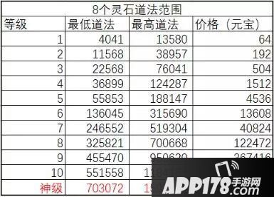 看上面的道法范围和价格,可以根据自己的元宝选择直接购买灵石还是依靠兽神掉落慢慢积累。目前来说,8个灵石升到5级基本没压力的,元宝多点的话可以升到6或者7级,土豪随意。