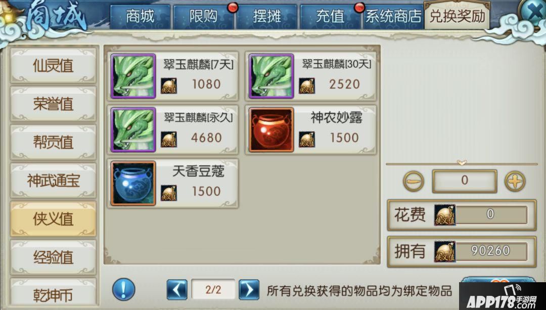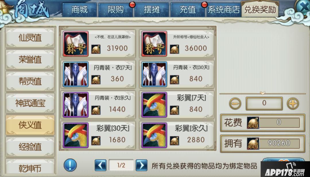 1、玩家可用获取到的侠义值在 商城-兑换奖励-侠义值 中 兑换物品。