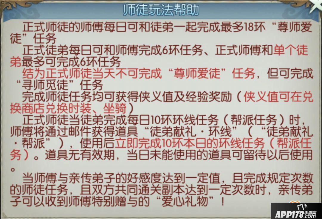 2、一个师傅最多可收3个徒弟,每天可以完成总共18环“尊师爱徒”的师徒任务,每天最高可获得450点狭义值;