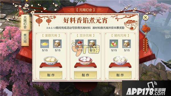 玩家通过收集不同的元宵材料制作不同种类的元宵,参加游戏内的无筝琴、神兵幻境、师门任务即可获得元宵材料。不同材料组合制作的元宵种类不同,可获得的奖励也不相同,元宵种类分为莲蓉元宵、豆沙元宵以及猪肉元宵,