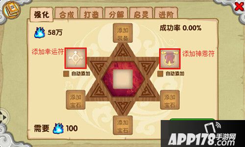 PS:强化装备需要添加幸运符和神恩符。添加幸运符,可以提高强化成功几率;添加神恩符,防止高级装备强化失败降级。