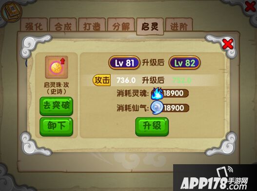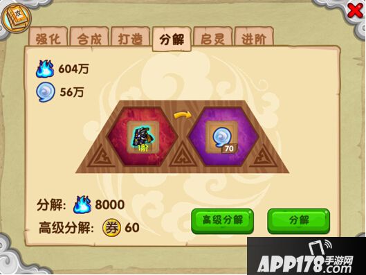 4、分解装备:在主界面的云中子处(炼丹炉)的分解界面,可以对装备进行分解,分解后可以获得一定量的仙气,值得注意的是,只有品质在蓝色及蓝色以上的装备才能进行分解哦!