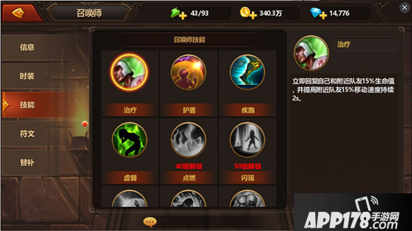 本次的内容同样还是在召唤师面板中,我们点击到“技能”栏