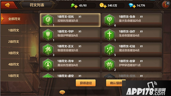 符文一共分为5个级别,越高级的符文效果也越好。我们可以预先准备好多种不同的符文组合来应对不同的战斗。
