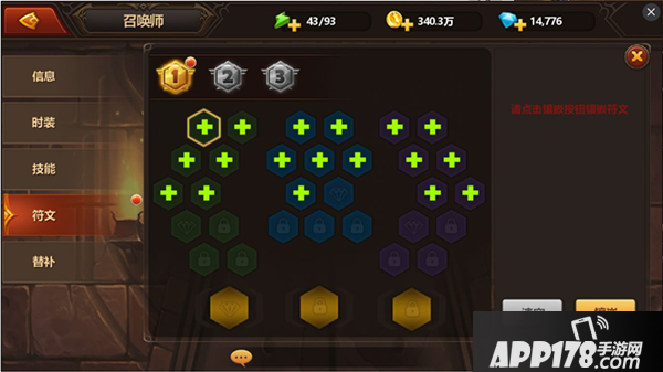 接着我们看到的符文镶嵌界面-随着召唤师等级的提升,能够镶嵌的符文数量也会逐渐增加(土豪们也可以用钻石来解锁镶嵌位)