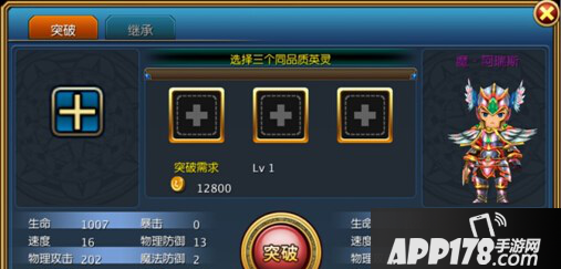 英灵突破分“魔”、“神”、“圣”三级,分别在1级、20级、40级的时候各允许突破一次,每次突破需要消耗三张同品质和等级的英灵。英灵突破成功率为100%
