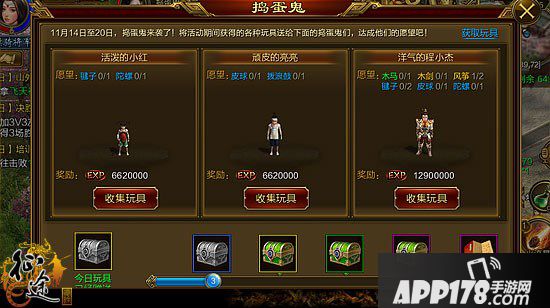 游戏主界面上有捣蛋鬼活动图标,点击后进入到活动界面。玩家可以查看到每个礼物需要的玩具种类和数量以及当前的收集进度。