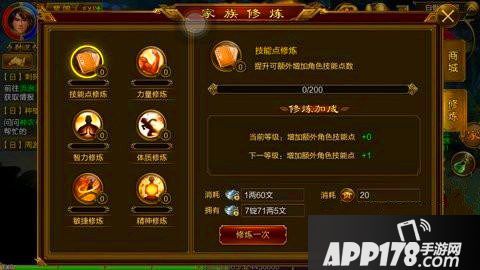 修炼栏目为玩家提供了六种属性的修炼分别为:力量、技能、体质、智力、精神、敏捷。