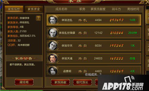 升级可增加家族人口上限,在升到指定等级后,家族可以招收更多的族员。以及家族成员可在此查看家族的等级,运作情况,俸禄等信息。