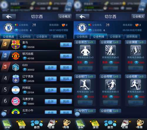 在《最佳阵容》中,“公会副本”、“公会挑战”、“公会科技”、“团队挑战”是公会系统中重要的玩法。“公会副本”是消耗“红茶”进行副本挑战,可以获得高等级的球员装备;“公会挑战”则是公会之间的PVP玩法,是重要的红茶获取途径;“公会科技”是提升自身战斗力的“黑科技”,为公会成员们直接提供属性加成;“团队挑战”则是“公会BOSS”的游戏玩法,简单粗暴的福利活动就是干!