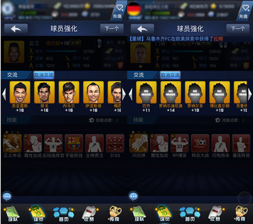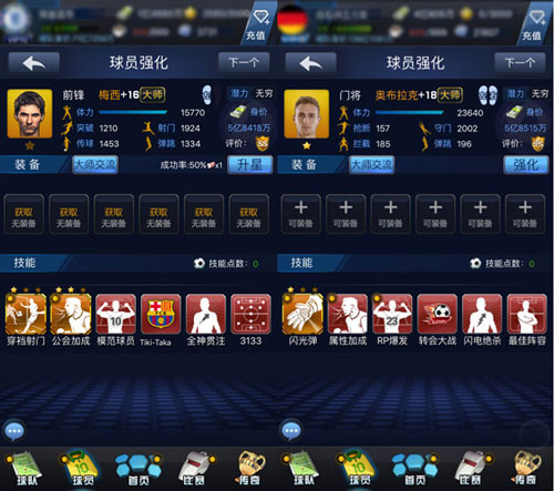 选择属性之后,将进入到技能的选择搭配页面。技能的重要性毋庸置疑,自然不能草草了之。游戏中,主技能与号码技能对球员的影响极大,不小心让你的梅西、C罗们披挂1号球衣、用着门墙之类的技能的话,那可真是让人欲哭无泪呢!