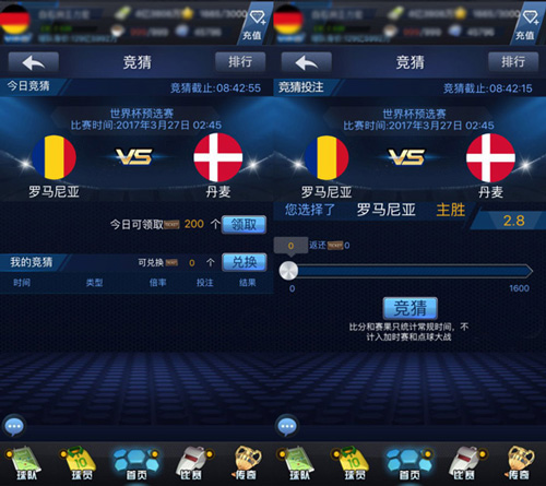 在《最佳阵容》游戏首页右中侧位置放了一台平板,就是竞猜的按钮,点击后可以进入每日的竞猜页面。玩家每日可领取一定的免费竞猜彩票,玩家们可通过参与竞猜,一旦竞猜正确,即可根据赔率获得相应的彩卷。同时,这些彩票可以以10:1的比例兑换成为游戏钻石,这意味着攒齐2W彩票就能飞一次环球,梅西、C罗在向你招手!