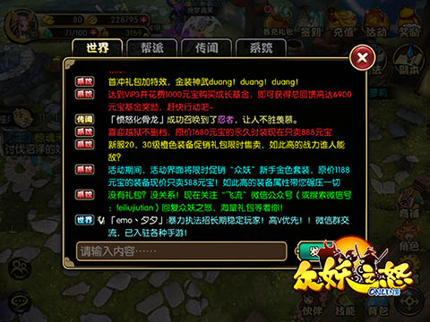 想表白?想交流?大胆说出来!《众妖之怒》开放聊天系统,世界、帮派、传闻、系统四大频道不止让玩家可以获悉系统播放的游戏内最新资讯,还可以让玩家随时抒发情绪,想聊就聊,遇到心仪的TA,不妨大胆说出来。同时,游戏开放的好友功能,让玩家可以更加亲密互动,掌握对方的上下线、角色资料,悄悄发个邮件、私密聊天,缘分也许突然就到了!