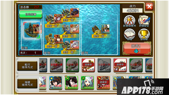 重要炮兵的输出放在最两翼,防御高的放中间因为大多数投石船优先砸最中间的船,这种目前是防御力最强的组合原因是炮击的AI判断比白刃队需要的AI少,不用考虑先打谁怎么上buff问题,防守中具有一定的优势