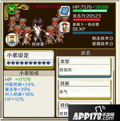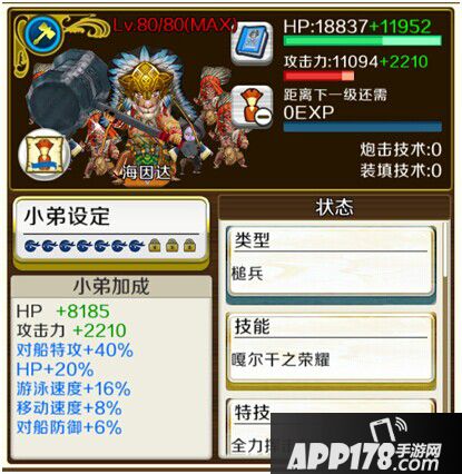 纯体力小弟一线属性 +8%体力 +6%对人防御 +6%对船防御 +6%暴击 +8对船特攻