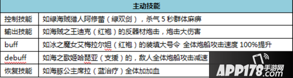 主动技能分为【控制技能】、【输出技能】、【buff】、【debuff】、【恢复技能】