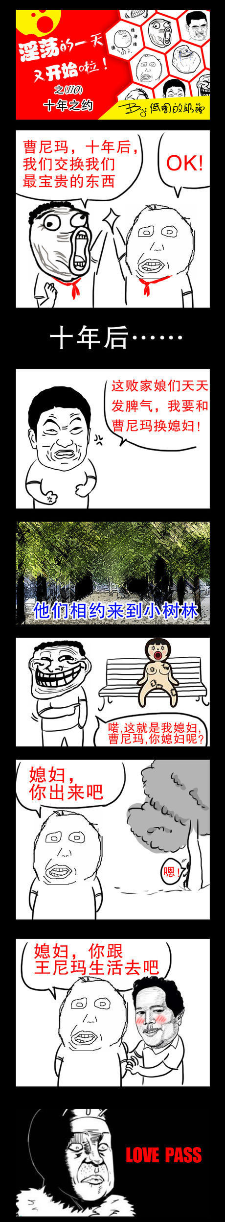 王尼玛和草泥马在学生时期曾相互约定,十年以后互相交换各自最宝贵的东西。一眨眼,十年已过去,到了两尼玛兑现十年之约承诺的时候了,两人也都各自履行了十年前的承诺,可是就在这时,小编都给看呆了!小伙伴们,你们想知道两尼玛互相交换的是啥宝贵东西吗?好了,话不多说,接下来,就让我们一起来看看这组,淫荡的一天又开始啦系列之十年之约暴走漫画,看完你们就知道啦!