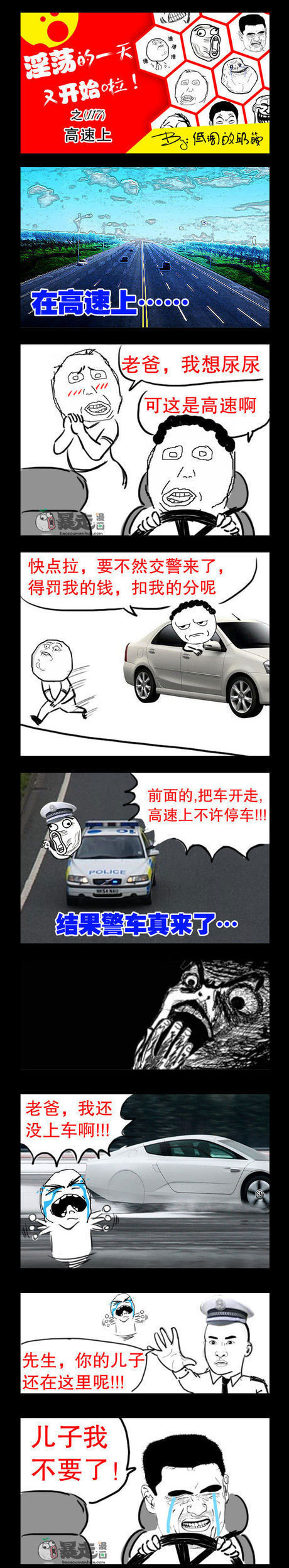 小伙伴们你们可知道,在高速公路上可是有很多限制性的,而且在高速公路上开车的小伙伴们也要倍加小心才能。今天小编就为大家带来了一组淫荡的一天又开始啦系列之高速上暴走漫画,小伙伴们你们知道尼玛和尼爸在高速上又发生了什么有趣的逗比事件吗?好了,话不多说,接下来,小伙伴们就快来和小编一起来看看这组淫荡的一天又开始啦系列之高速上暴走漫画,看完就知道啦!