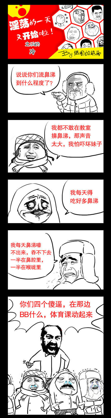 这天啊,是一天一头越来越冷,这感冒发烧流鼻涕,就人人都在所难免。今天小编为大家带来的是一组,淫荡的一天又开始啦系列之冷暴走漫画,在今天的这组淫荡的一天又开始啦系列之冷暴走漫画中,尼玛和他的同学们都在这寒冷的天气里,感冒流鼻涕了。好了,小编话就说到这,之余详情嘛,那就请各位小伙伴们自个儿去瞧瞧啦。不过小编在这贴心提醒下各位小伙伴们:天冷了,记得多穿点衣服哦!