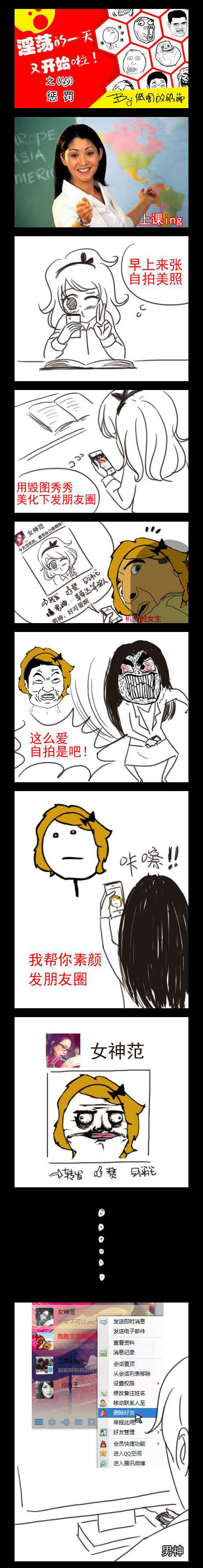 小编觉得吧,现在的妹纸们啊,噢不对,不光是妹纸们,有很多男生们,也都中了爱自拍的病。也不知各位小伙伴们是否听过“自拍是种病,得治”的网络名言,小编觉得吧,这爱美之心,人皆有之。今天呢,小编就为大家带来了这组,淫荡的一天又开始啦系列之惩罚暴走漫画,在今天的这组暴走漫画中,尼美因在课堂上玩起来自拍,被老师察觉后,也的到了爱自拍的“惩罚”,这对尼美来说,可真真是一出杯具啊!好了,话不多说,之余详情嘛,小伙伴们还是自个儿来看看这组,淫荡的一天又开始啦系列之惩罚暴走漫画,编知晓啦!