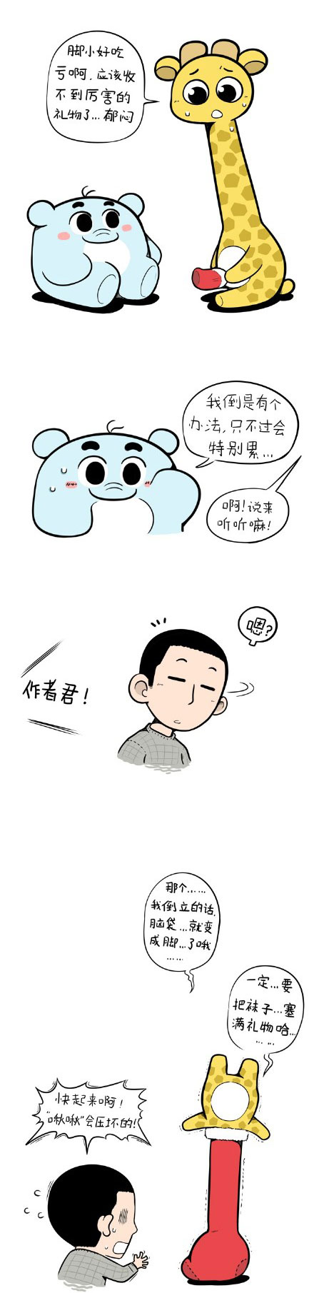 小编今天为大家带来的是一组,大象ROV作品之圣诞袜治愈系漫画。在今天的这组搞笑漫画中呢,鹿尤君因为自己脚小,觉得自己应该收不到什么厉害的礼物而感到郁闷,这是,大象君给鹿尤君出了一个好主意,这个好主意令鹿尤君感到非常满意,但小编看到这番场景也是惊呆了。各位小伙伴们,你们想知道大象君给鹿尤君出的是什么好主意吗?想知道的小伙伴们就感觉来看看这组,大象ROV作品之圣诞袜治愈系漫画吧,看完就知道啦!