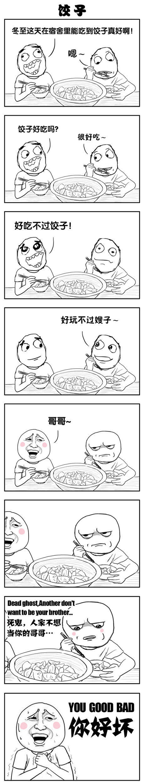 小伙伴们,你们是否觉得在这寒冷的大冬天里,吃上一碗热乎乎的食物,那可真真是在好不过了呢?的确,这就犹如雪中送炭般,顿时让人心头一阵温暖之意。今天小编为大家带来的是一组暴走漫画之饺子,小编不得不说暴走漫画的内涵邪恶真真是太强大了,竟能从一碗饺子上去话题,小编真真是太佩服啦。好了,话不多说,接下来,小伙伴们还是一起来看看这组暴走漫画之饺子吧!