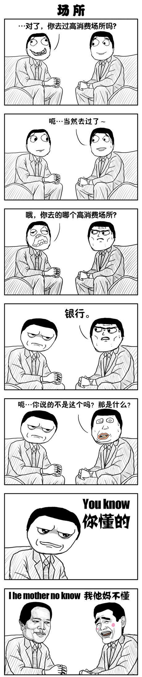 小伙伴们你们造吗,在尼玛的眼中,最高档的场所居然是银行。那么问题来了,各位小伙伴们,在你们的眼中,哪种场所才称得上是高档场所呢?其实小编对此也没有很准确的定义呢。好了,话不多说,接下来,大家就和小编一起来看看这组暴走漫画之场所,看看尼玛的朋友眼中所定义的高档场所是哪吧。