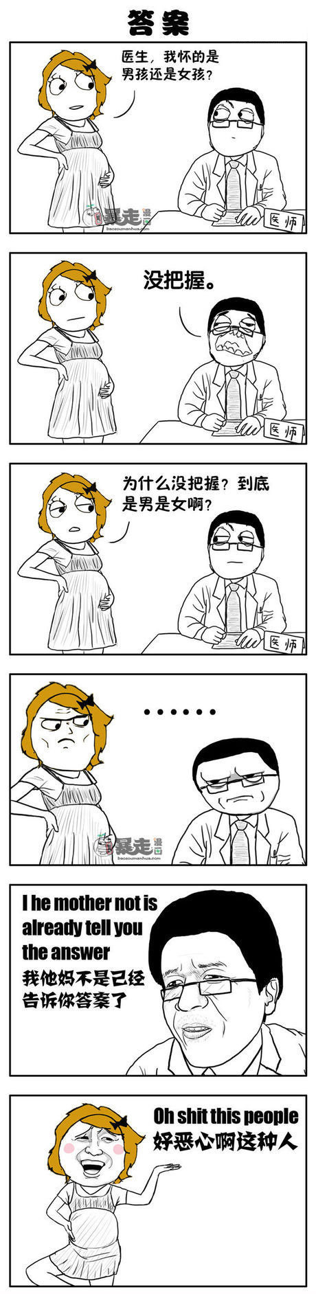 各位小伙伴们你们想知道尼美怀的是男孩儿,还是女孩儿吗?今天呢,小编为大家带来的这组暴走漫画之答案中,就可以知道噢。不过说句老实话,小编也是看了第二遍才看懂医生的回答。好了好了,各位小伙伴们还是赶快来看看这组暴走漫画吧,不然小编待会儿又忍不住剧透了,那这样可就没意思了噢。