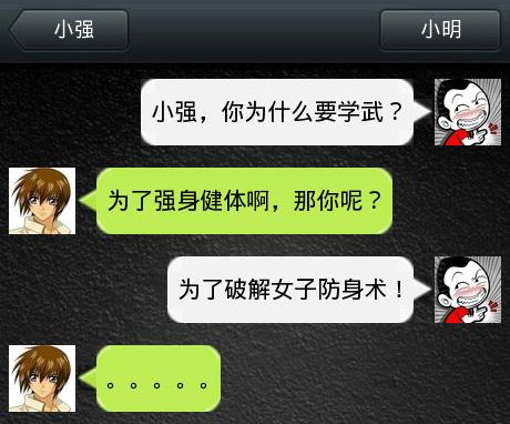 各位小伙伴们你们知道为什么有人会去学武吗?你们还知道藏私房钱的前提是你需要有什么吗?你们知道女生学哪种乐器更容易培养气质吗?你们还知道为什么男生会觉得女生很难伺候吗?今天呢,小编为大家带来的是一组脑残对话精彩集锦之小明系列3,在今天的这组小明搞笑对话中,就有答案噢,好了,话不多说,小伙伴们快来围观吧!