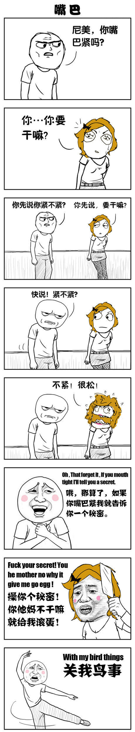 小伙伴们,假如你们要将一个秘密告诉一个人,那么你们会告诉嘴巴紧(口风)的人呢,还是会告诉一个藏不住小秘密的人呢?想必但凡有点脑子的人,都会选择前者吧。好了,今天啊,小编为大家带来的是一组暴走漫画之嘴巴,话不多说,小伙伴们还是赶紧来看看吧!