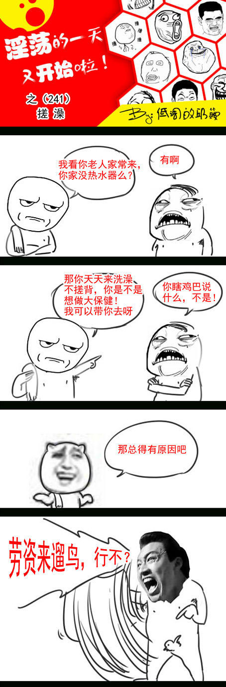 今天小编为大家带来的是一组,淫荡的一天又开始啦之搓澡暴走漫画。各位小伙伴们想知道在今天的这组暴走漫画中,都有哪些内涵搞笑事件发生吗?话不多说,想知道的小伙伴们就赶紧来和小编一起来看看这组,淫荡的一天又开始啦之搓澡机暴走漫画吧!