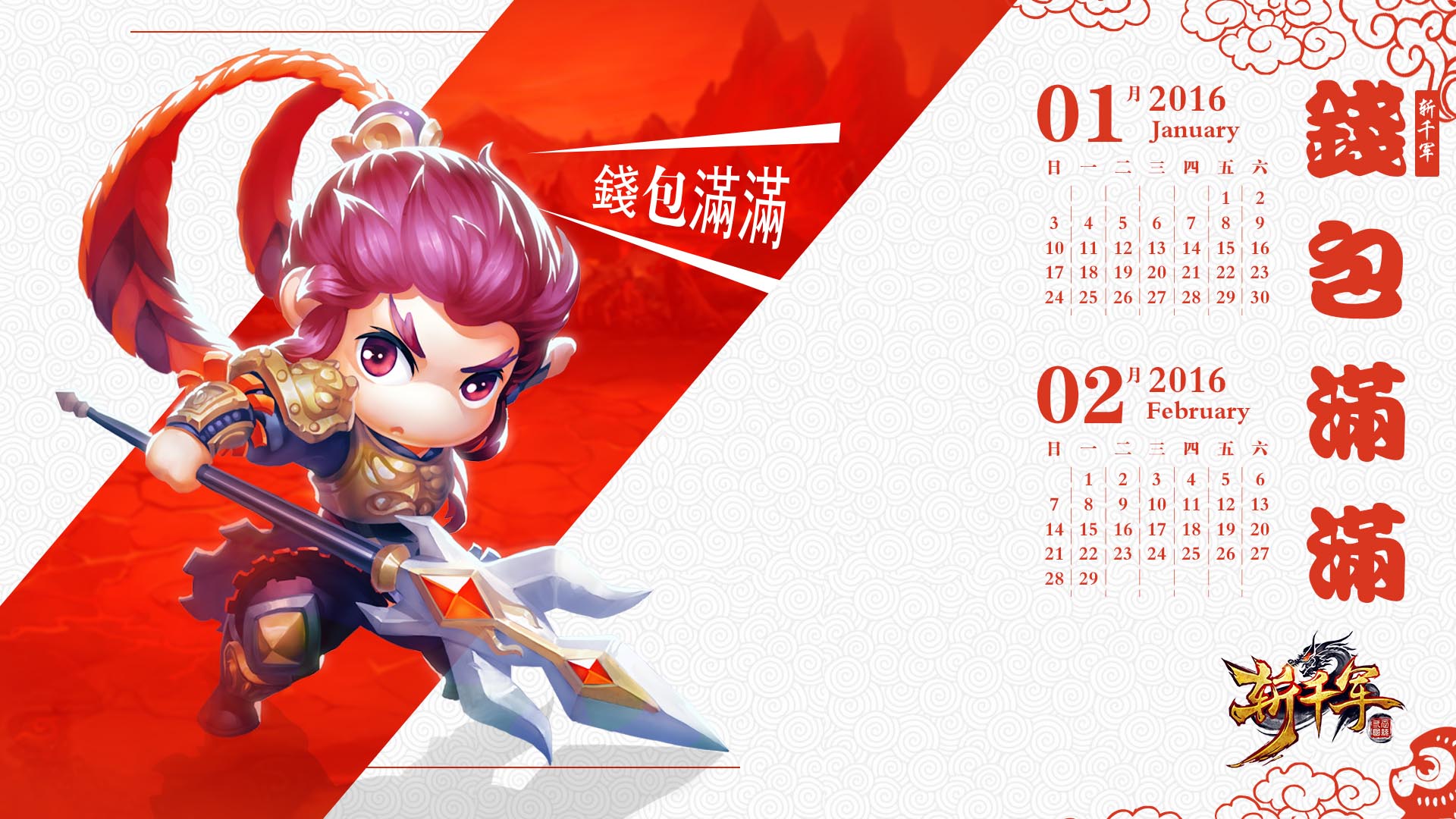现在已是2016年1月月底了,随着距离春节的时间越来越近,许多游戏厂商们,都纷纷自制了游戏2016年月历主题壁纸。这不,今天呢,小编为大家带来的是一组,由灵石游戏运营首款3D战争直男MMO新游《斩千军》,2016年月历官方高清壁纸,话不多说,大家快来看看吧!壁纸分辨率:1920*1080