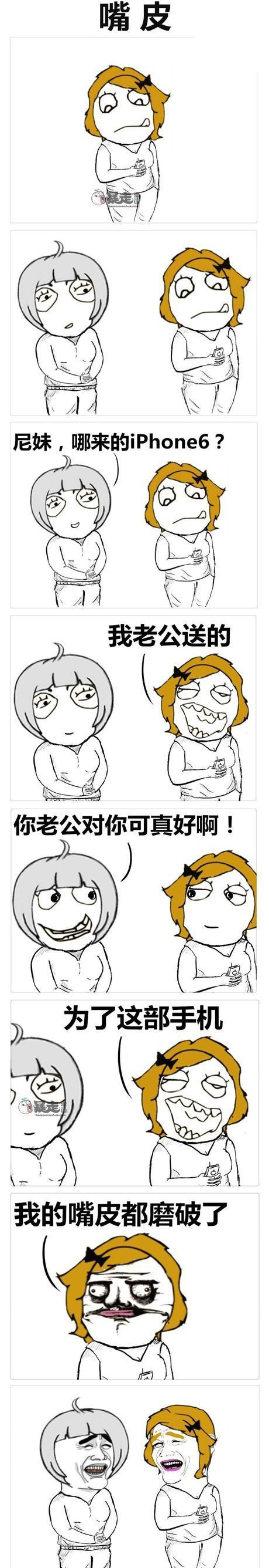 最近这iPhone6可是炙手可热的“宝物”啊,但由于这价钱偏高,有不少小伙伴们都只能是想想而已,真真是心有余而力不足啊,可是小伙伴们你们知道吗?尼美小姐居然手中拿着一台iPhone6,经过尼美朋友的一问,才知道是尼美的老公送给尼美的,那么小伙伴们你们想知道尼美究竟用了什么高招从她老公那得到了这台iPhone6吗?话不多说,那么接下来,就让我们一起来看看这组暴走漫画之嘴皮,看完就知道啦!但是小编在这啰嗦一句:内容偏邪恶,小伙伴们就只是看看就好了哦!
